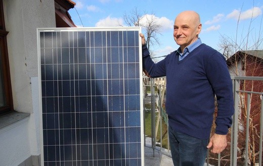 Dr.hab. Marek Lipiński prezentuje ogniwa fotowoltaiczne.