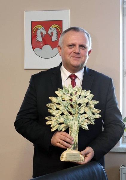Wójt Krzysztof Fiałkowski ze statuetką Drzewa Roku.