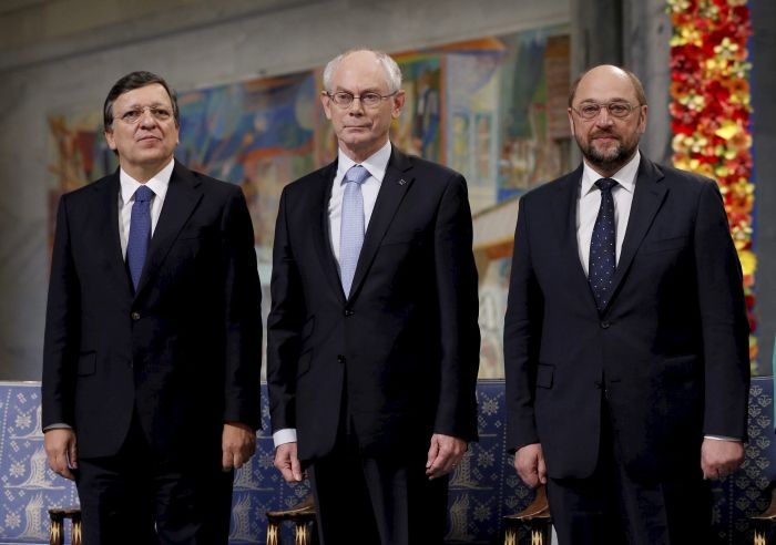 Szefowie trzech głównych instytucji UE Herman Van Rompuy, Jose Manuel Barroso i Martin Schulz odebrali w poniedziałek w Ratuszu w Oslo tegoroczną Pokojową Nagrodę Nobla przyznaną Unii Europejskiej.