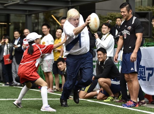 Boris Johnson bierze udział w turnieju w ulicznym rugby w Tokyo.