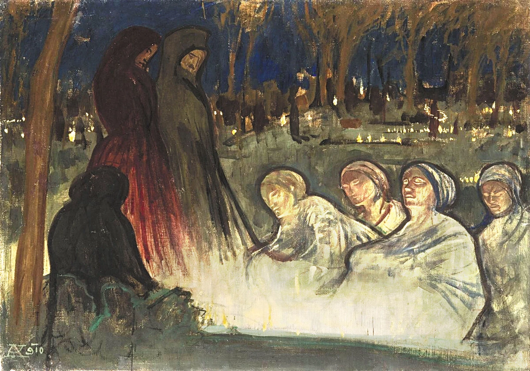 Często te obrazy wyrażają tylko fascynację nastrojem rozświetlonego blaskiem świec cmentarza w Dzień Zaduszny. Czasami jednak zawierają głębsze treści. Tak jest w przypadku dzieł węgierskiego malarza i rzeźbiarza z Budapesztu, Aladára Körösfői-Kriescha (1863–1920). Był to człowiek głęboko religijny, a jego fascynacja twórczością prerafaelitów skłaniała go do sięgania po wyszukaną symbolikę. W 1910 i 1914 roku namalował dwa podobne obrazy: „Dzień zaduszny” i „Dzień Wszystkich Świętych”. Reprodukujemy tu pierwsze z tych dzieł.
