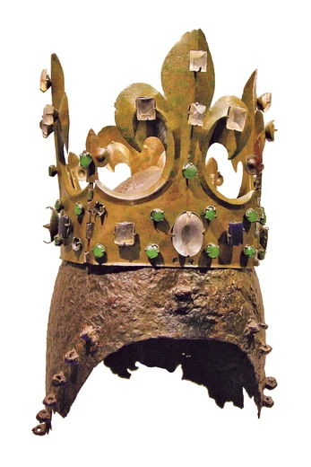Hełm i korona Kazimierza Wielkiego autor nieznany hełm: żelazo korona: stop miedzi i srebra, kryształ, szklane imitacje szmaragdów i szafirów Polska, przed 1370 Skarbiec katedry na Wawelu, Kraków.