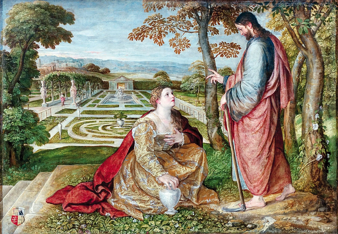 Chrystus po zmartwychwstaniu ukazał się Marii Magdalenie, gdy płakała nad Jego pustym grobem, sądząc, że ktoś wykradł ciało. Święta wciąż trzyma dłoń na naczyniu z niepotrzebnymi już wonnościami. W ręce Zmartwychwstałego widzimy natomiast motykę. To nawiązanie do tekstu Ewangelii, gdzie czytamy, że Maria Magdalena nie poznała początkowo Jezusa: „Ona zaś sądząc, że to jest ogrodnik, powiedziała do Niego: »Panie, jeśli ty Go przeniosłeś, powiedz mi, gdzie Go położyłeś, a ja Go wezmę«. Jezus rzekł do niej: »Mario«. A ona, obróciwszy się, powiedziała do Niego po hebrajsku: »Rabbuni«, to znaczy: Nauczycielu!” (J 20,15-16).