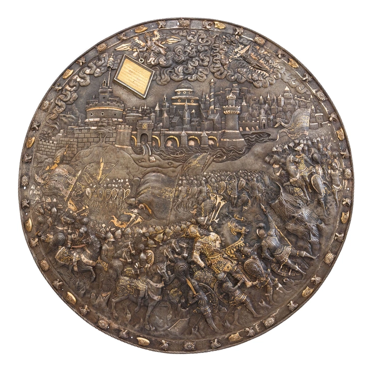 Tarcza „wróżebna” Jana III Sobieskiego autor nieznany, żelazo złocone i srebrzone, brąz złocony, Mediolan (?), 1560–1580 Muzeum Książąt Czartoryskich, oddział Muzeum Narodowego, Kraków