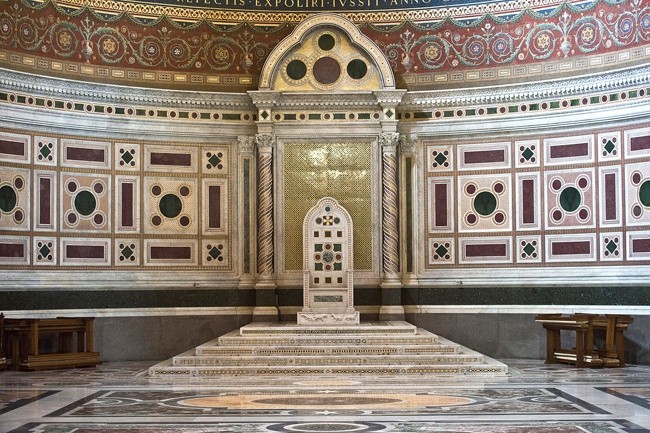 Aktualny tron papieski (katedra) w absydzie bazyliki. W powiększeniu – płyta z pogańskiej światyni z symbolami zwierząt- -demonów, które depcze papież