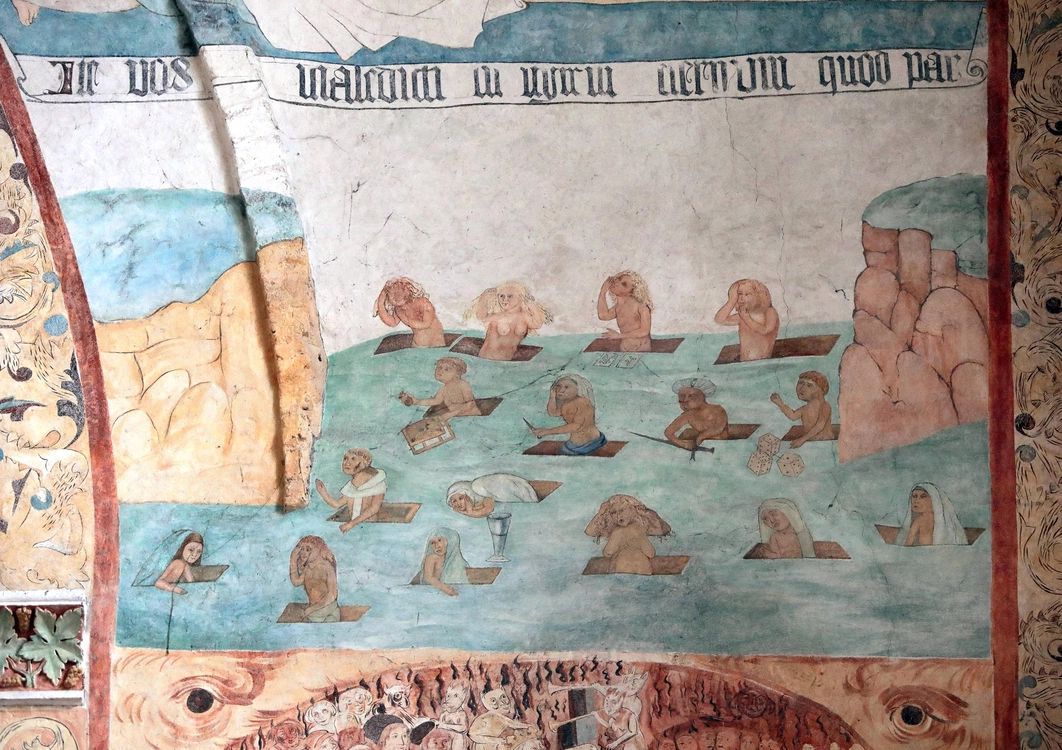 Fresk wizja piekła, nadzy grzesznicy wychodzący z grobów , niektórzy wskazują na przyczyny swych grzechów: karty, kości do gry, pieniądze.
